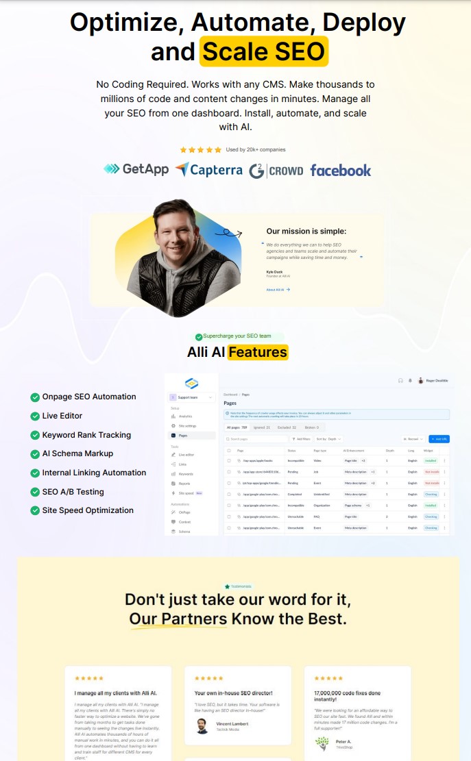 Alli AI is a cutting-edge AI SEO software designed to empower marketing agencies and enterprises by automating and optimizing on-page SEO tasks. With its user-friendly interface, Alli AI seamlessly integrates with any CMS, enabling users to implement thousands of code and content changes within minutes, eliminating the need for manual coding. Key features include automated SEO optimization, comprehensive keyword research tools, rank tracking, and backlink building capabilities. The platform also offers a Site Speed Optimizer, which can reduce website page load times by up to 80%, enhancing user experience and search engine rankings. Alli AI’s Localization Automation ensures content is tailored for specific audiences, boosting global reach. With flexible pricing plans starting at $299 per month for the Business plan, Alli AI caters to consultants, startups, and small teams, while the Agency and Enterprise plans offer expanded features for larger organizations. A 10-day free trial is available for new users to experience the platform’s capabilities firsthand.